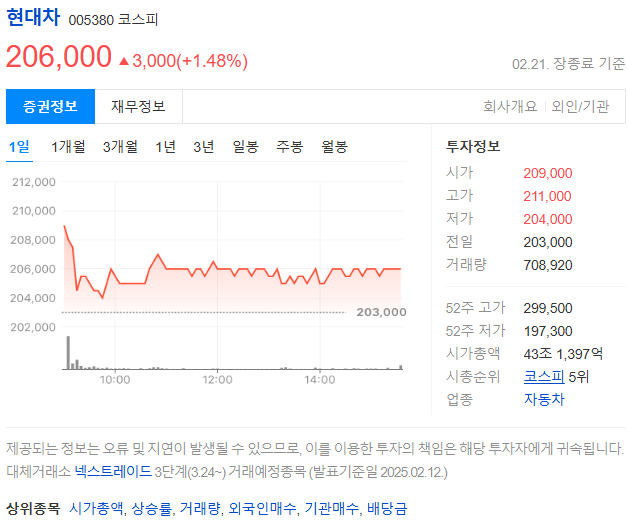 2025년 2월 21일 기준, 현대자동차의 주가는 206,000원으로 전일 대비 3,000원 상승했어요. 하지만 최근 3년간 주가 상승률은 8%로, 같은 기간 테슬라(14%), 도요타(33%), 비야디(BYD)(52%)에 비해 낮은 편입니다.