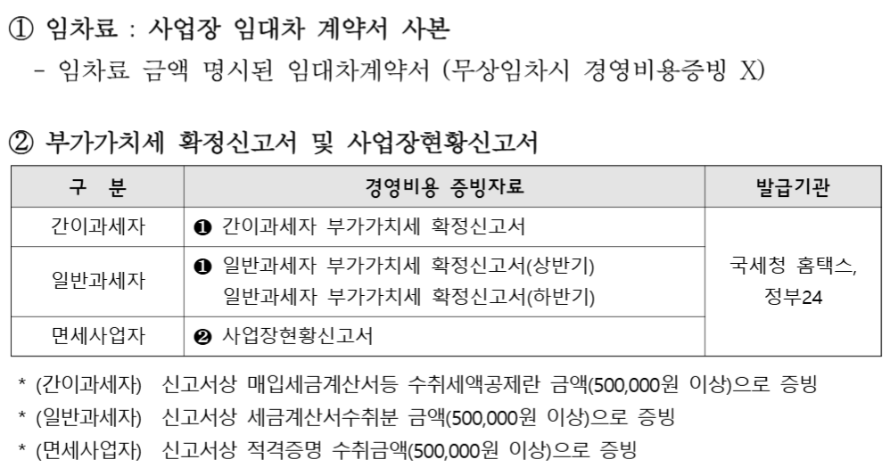 | ③ 경영비용지출 증빙자료 ('24년 ~ 공고일 전일)** | 국세청 홈택스등 | |