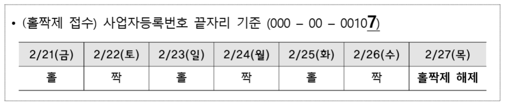 2. 홀짝제 시행: 사업자등록번호 끝자리 기준으로, 신청 초기인 2월 21일부터 26일까지 안정적인 시스템 운영을 위해 시행